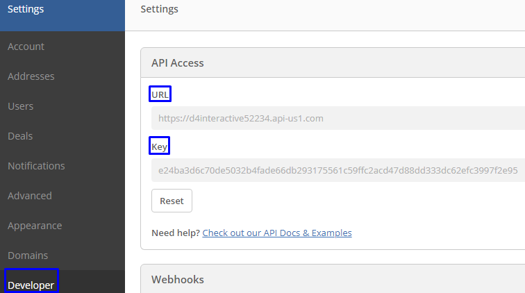 In the next screen, you can view the Developer under the setting section, where you could find the API key and URL. Copy it.