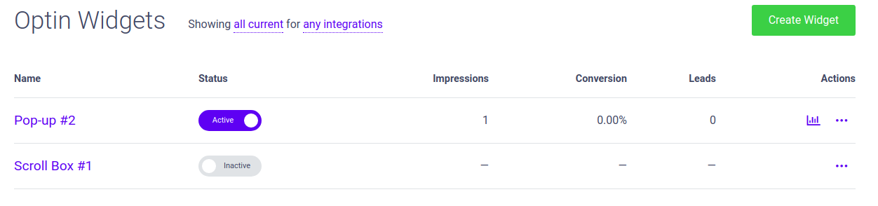 Once your website has been added to the Convertful, you need to create a new widget which you'd like to show to your visitors.
