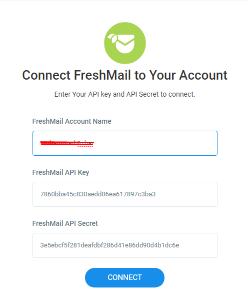 In this step, you need to input your credentials into the field, which includes FreshMail account name, API and Secret key and choose the list to connect with the Replug account.