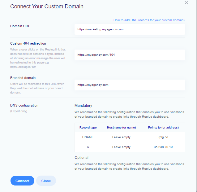 Soon as you click on the Connect button, your custom domain has added successfully in the Replug Account.