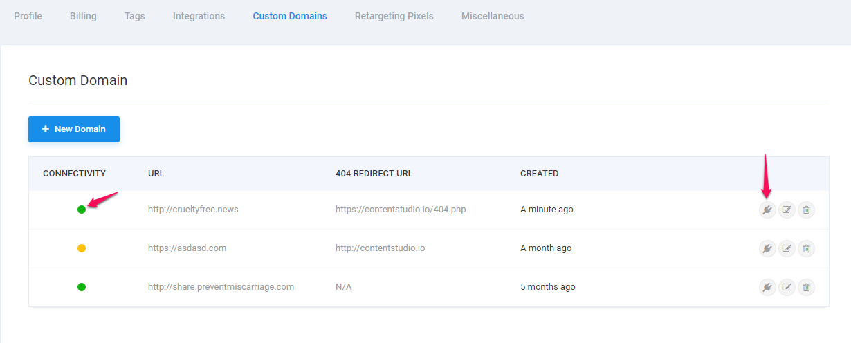 Check Connectivity: It will show that the custom domain is active and you can apply that with your Replug campaigns going forward. The green icon will assure it's connectivity.