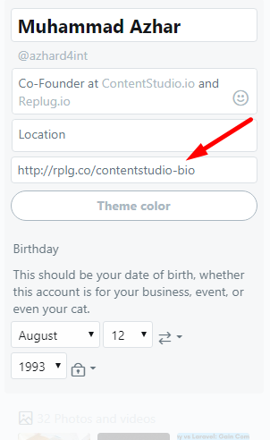 After this, you need to fill in basic information like name, location, website and so on. In the website field, you need to add your Replug link, so you can easily track the click and leads that is generated through Twitter.
