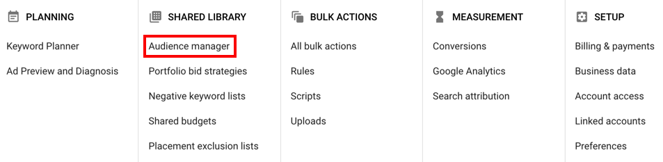 Sign in to the Google Adwords. Once you are there, Open the “Tools, Bills, and Settings” navigation bar and select “Audience Manager”.