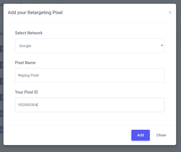 Navigate to the Replug Retargeting Pixels section. Add a new Pixel ID.