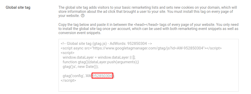 Within the Global site tag, you will see your Pixel ID in three places. Copy just the numeric value (NOT “AW-”) and paste that ID directly into Replug.