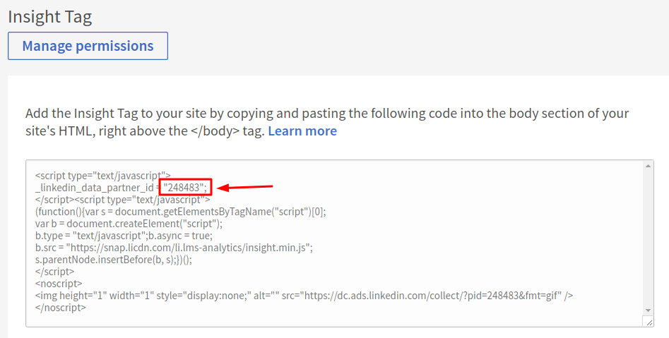 After clicking on Insight Tag, you will see the Javascript code. You only need to select the Partner ID as shown below: