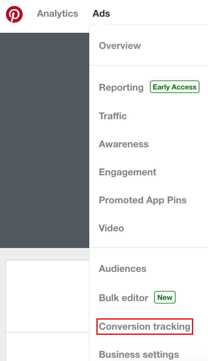 Sign into the Pinterest Ads Manager. Once you are there, open “Ads” drop-down and select “Conversion tracking”: