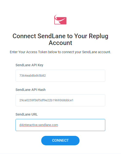 After that, you have to enter your API Key, API Hash and URL to integrate your SendLane account with Replug.