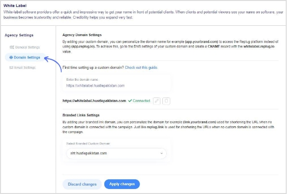 In this section, you can personalize the domain name. For example, Rebrand app.replug.io to a customized and branded domain name such as app.yourbrand.com