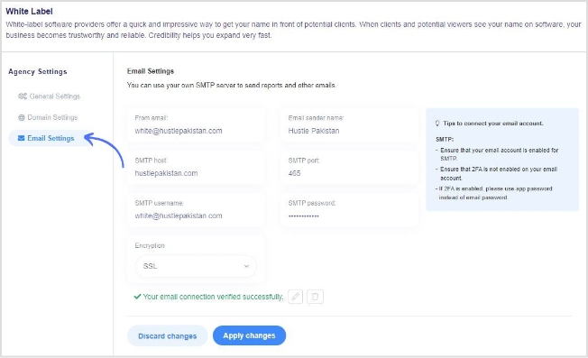 You need to fill in the given fields to set up your White-Label email settings. The given field settings are as under: