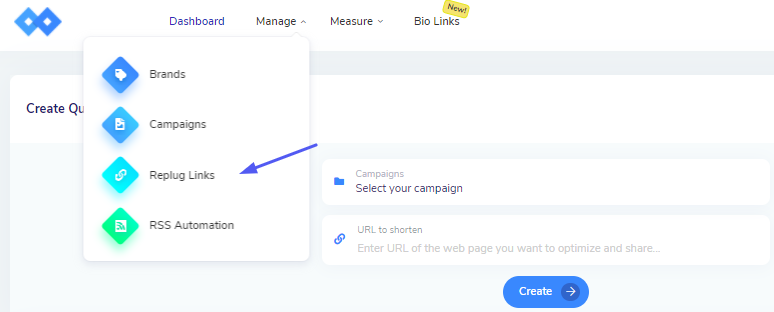 1. Log into your Replug Account and select Replug Links from the drop-down on Manage Tab