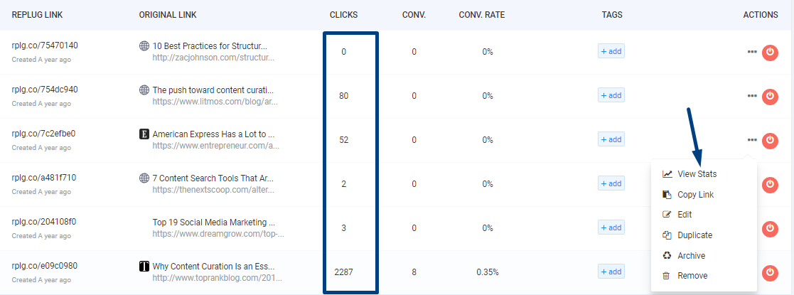 2. Hover over to the Replug Links page to track the clicks of the link.
