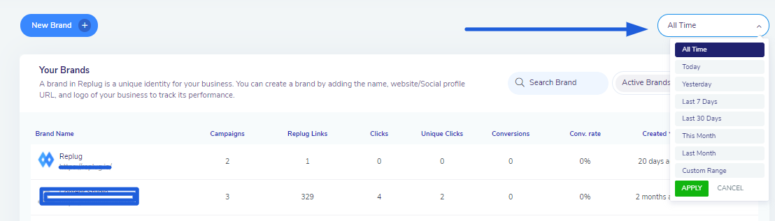 Also, you can choose a C ustom Range to set the Starting and Ending date for particular brands