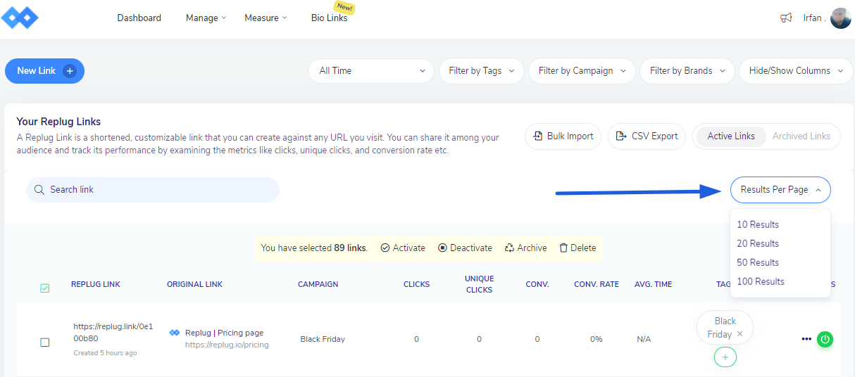 Afterward, choose the links, Example below shows that I choose 100 results and out of them I choose 89 links to Deactivate.