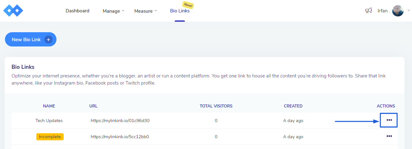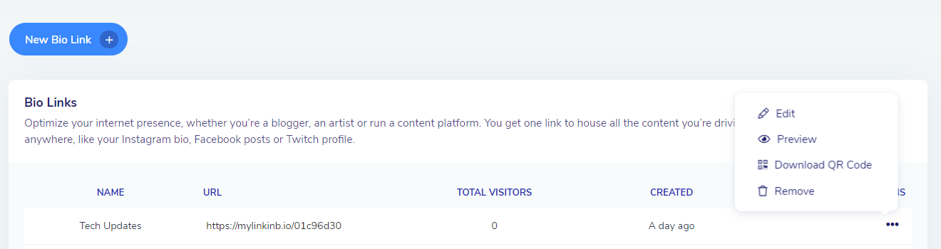 Once you have completed Adding Content to your bio link and finalizing it with desired themes, you can click on three dots button against your bio link to see more options. An example is given below.