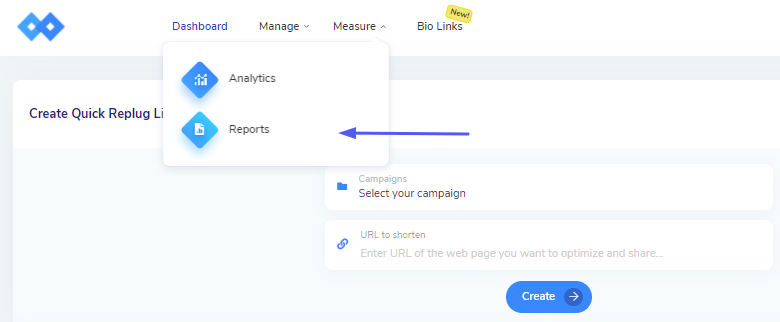 Starting off, from the Replug dashboard, click on Reports from the drop-down list on Measure.