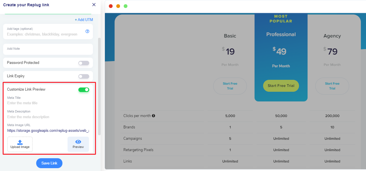 Now, you need to select the Campaign and add the URL of the website to create the Replug Link.