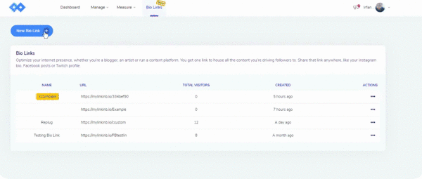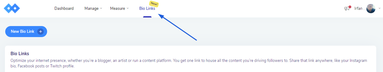 From the Navigation menu on the top, select Bio Links feature.