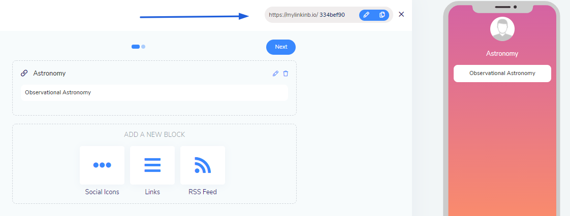 Clicking on the Next button from Add Content WIndow will take you to the next window where you can increase the aesthetic value of your Bio Links through making your Blocks look more attractive.