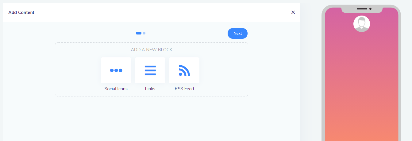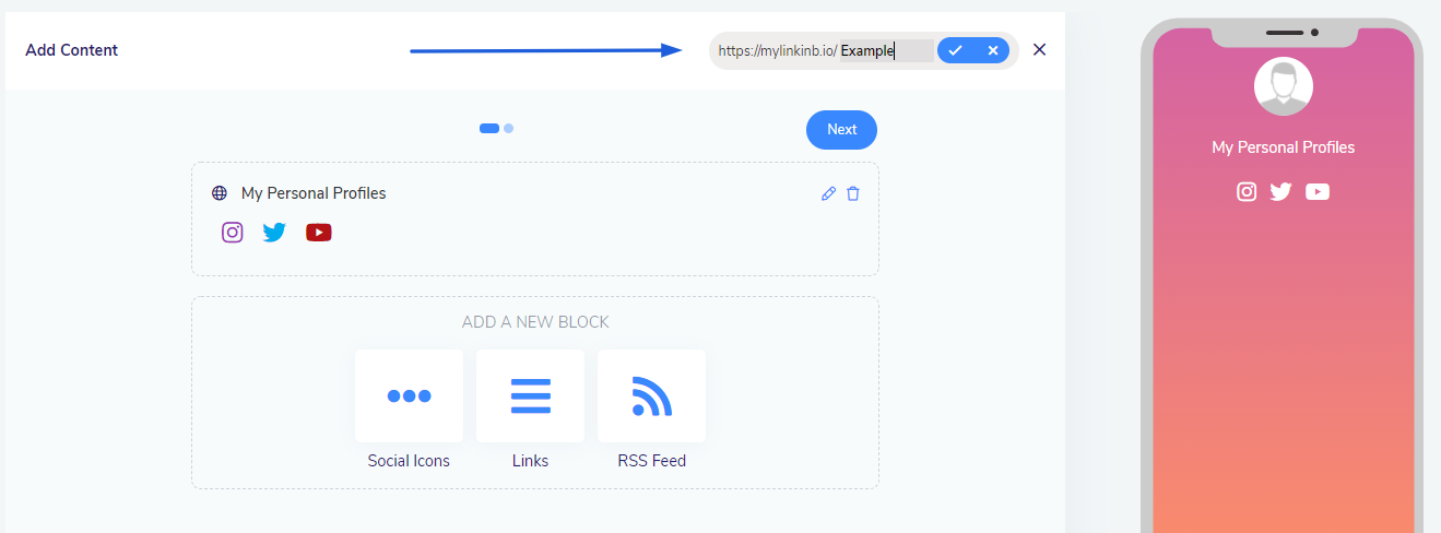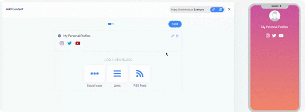 Clicking on Next button from Add Content WIndow will take you to the next window where you can increase the aesthetic value of your Bio Links through making your Blocks look more attractive.