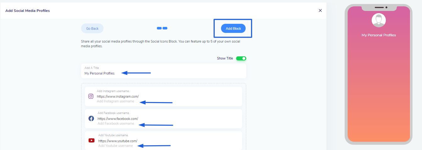 Please grasp details from the GIFs illustration on creating Bio Links adding Social Icons as a Block from scratch.