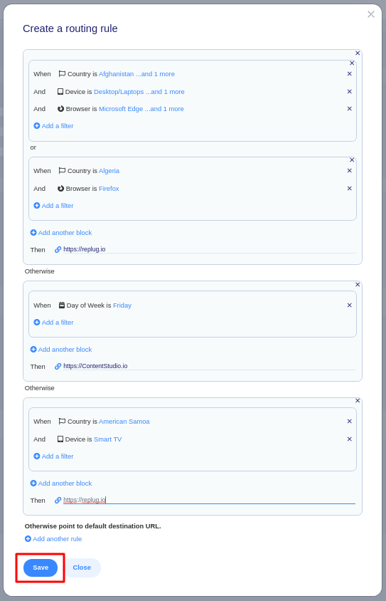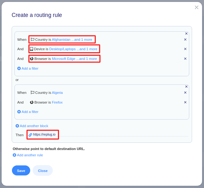 • Add another Block means that we can add another destination URL (Then) which can be visited if all the filters (inside the block) are matched.