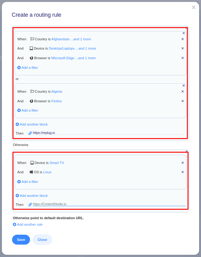 Each Rule contains a destination URL known as 'Then', when any block of the rule is matched, we follow along with the destination URL mentioned in that Rule. For a block to be considered as Matched, ALL filters in that block should be matched.